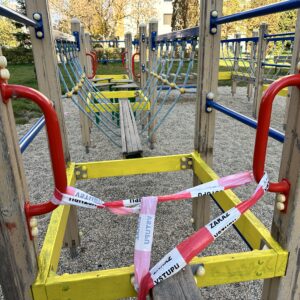 Z ihriska na Tureckej sme museli vybrať dosky, ktoré je treba opraviť alebo vymeniť. Aby sme upozornili na to, že ihrisko nie je v stave, aby sa tam mohli hrať deti, bolo potrebné dať okolo ihriska pásku so zákazom vstupu.
