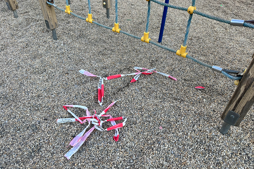 Opäť sme ihrisko označili dookola páskou a čo myslíte? Pásku opäť niekto strhol.
