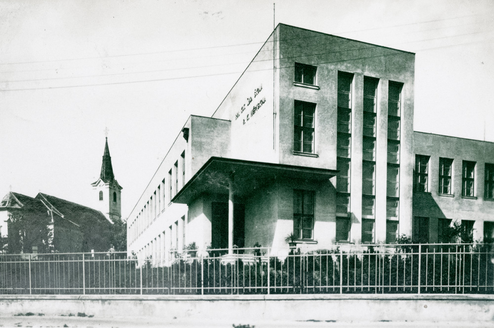 Základný kameň novej školy položili 28. októbra 1931 za prítomnosti zástupcov štátu, cirkvi i mesta. Práce napredovali podľa plánu, budova už mala strechu, keď na jeseň 1932 Josef Halzl náhle zomrel. Jeho smrť výstavbu pozastavila – dedičia požiadali o dohodu s mestom, no na jar 1933 sa pokračovalo, aj keď v zmenenej podobe, ale škola bola ešte v tom istom roku otvorená.