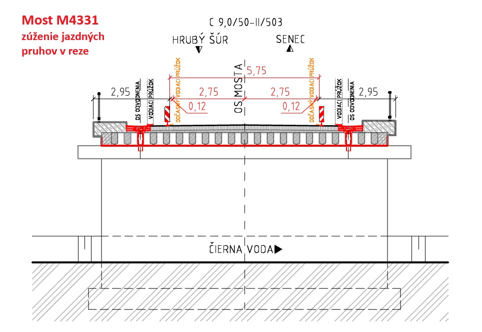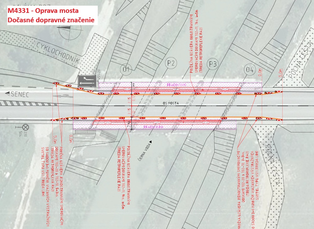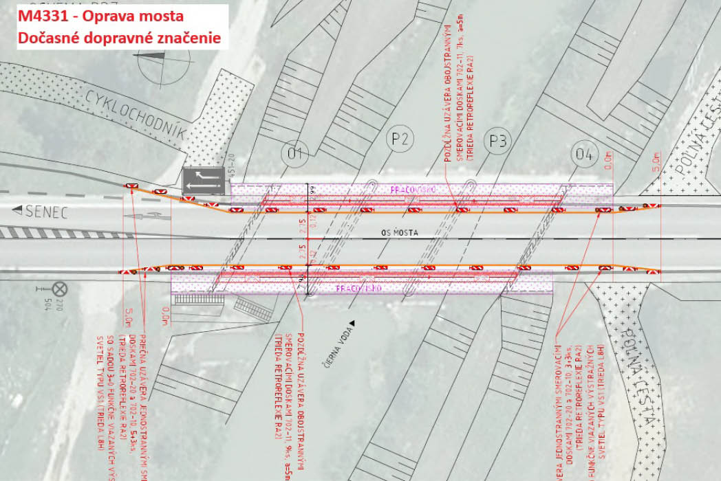 Od piatka 10.10.2025 počas čiastočnej uzávery cesty II/503 budú stavebné práce realizované aj v miestach krajníc na vozovke, kde budú vymenené pôvodné odvodňovače a izolácia. Počas celej doby realizácie stavebných prác na moste M4331 bude zachovaná obojsmerná doprava, ktorá bude vedená v zúžených jazdných pruhoch na moste so šírkou pruhu min. 2,75 m a bude usmernená prenosným dopravným značením.