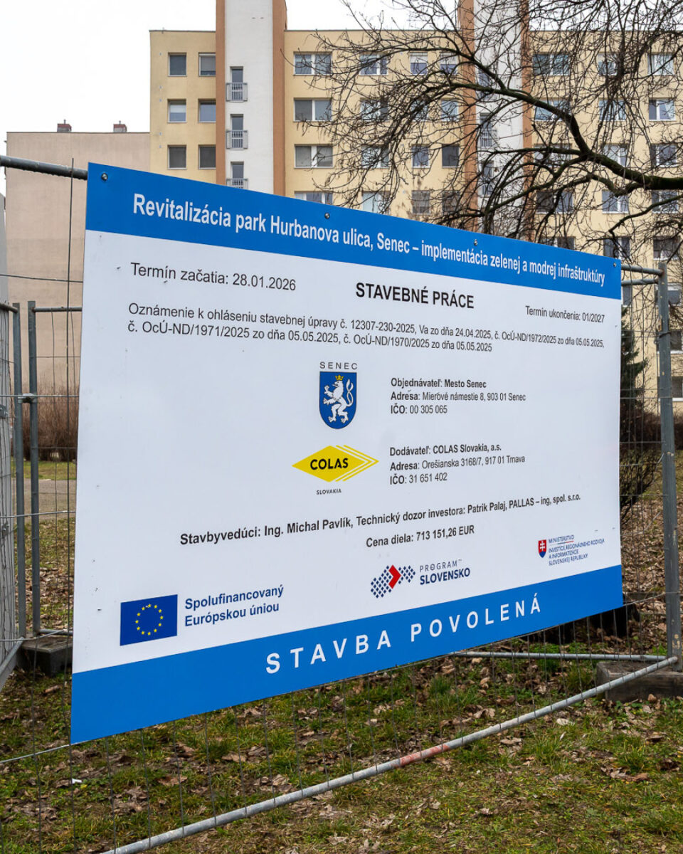 Stavebné práce v rámci projektu Revitalizácia park Hurbanova ulica, Senec – implementácia zelenej a modrej infraštruktúry budú prebiehať postupne v 3 etapách a vyžiadajú si dočasnú zmenu organizácie dopravy parkovania v riešenom území.