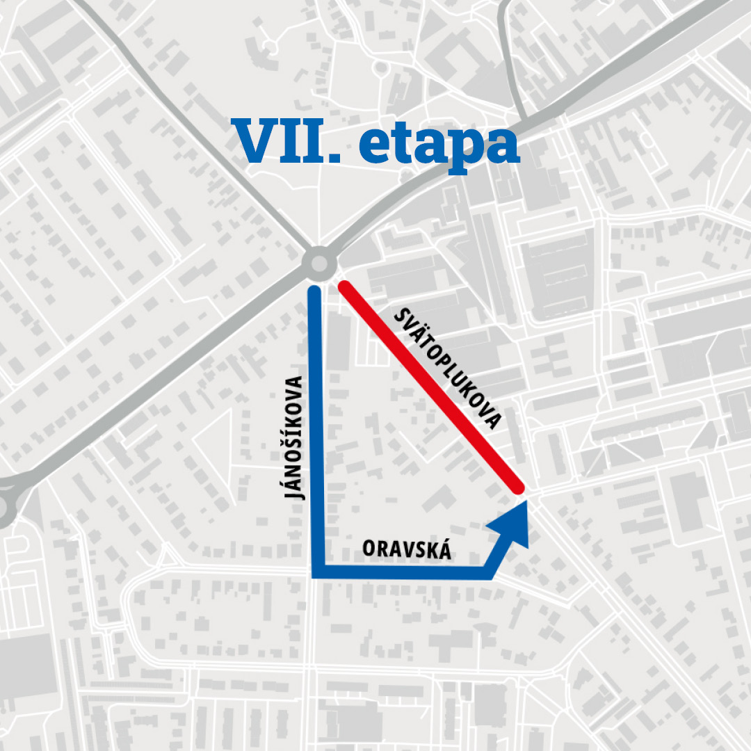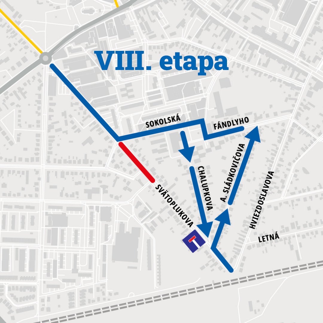 Následne bude realizovaná VIII. Etapa spojená s prácami v úseku medzi Sokolskou a Kysuckou ulicou, táto bude spojená tiež s dočasnou výlukou dopravy v tomto úseku. Obchádzka povedie cez ulice Sokolská, Chalupkova a Andreja Sládkoviča.