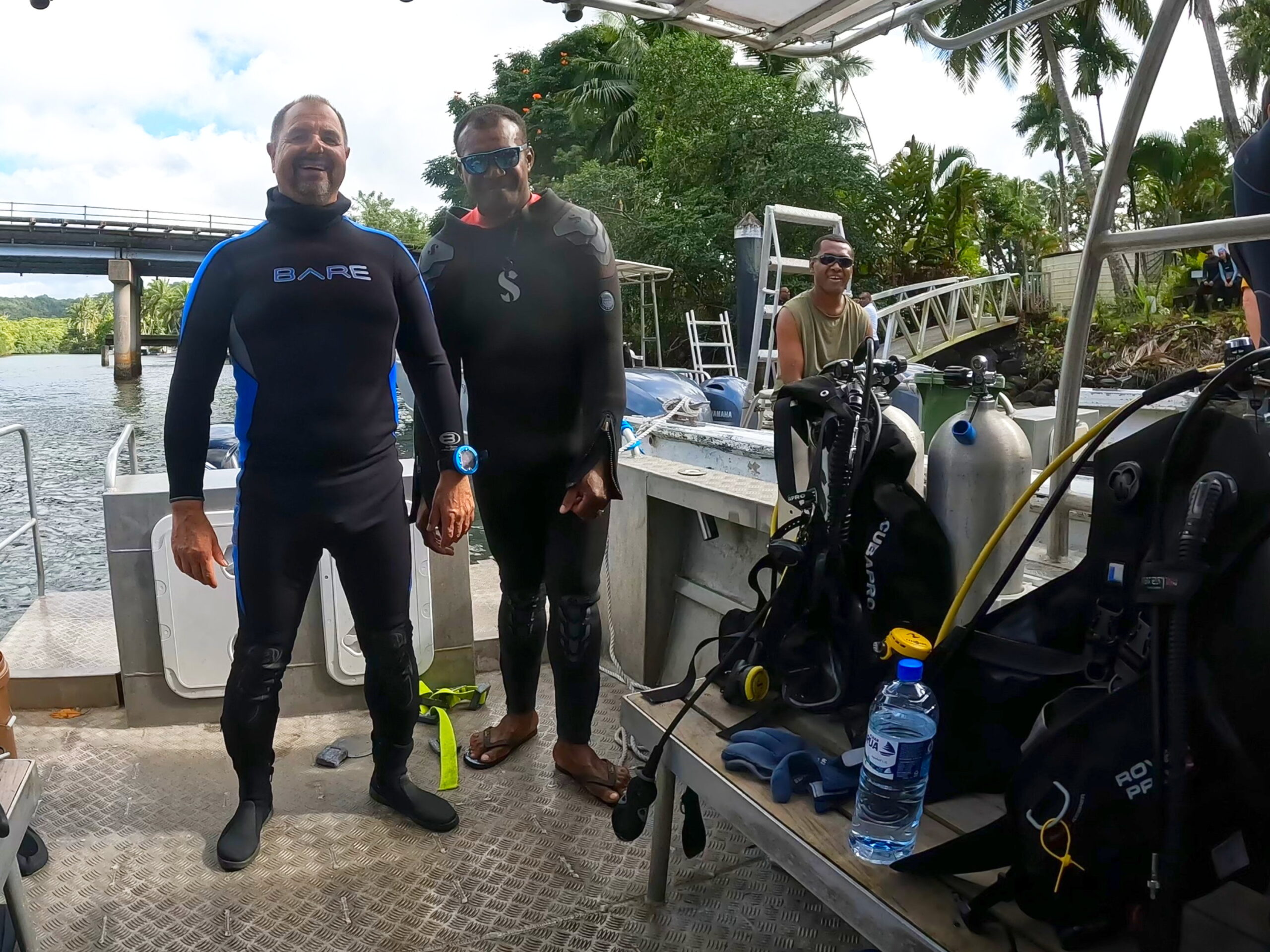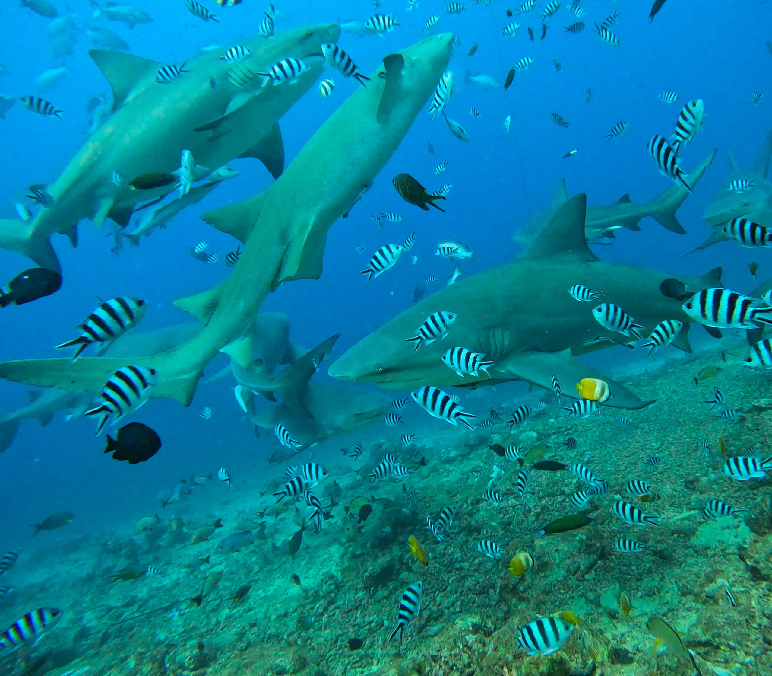 Po 15 minútach majú sprievodcovia prázdne vzduchové bomby. Keď pozerám na naše plné zásoby kyslíka, odmietam sa vynoriť a s kolegom trávime pri dne ďalšiu takmer hodinu. Na loď vychádzam posledný a nemôžem z týchto nádherných dravcov spustiť oči. V tom sa jeden bleskurýchlo vynoril z hlbočiny a saltom pri rebríku ma takmer zhodil späť do mora. Otrasený, ale šťastný, sa vraciam ku kolegom a v mysli už plánujem ďalší ponor.