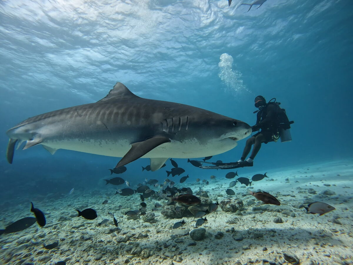 Vstup do mora je skokom z lode, hlbočina prudkým zrázom klesá až do 800 metrovej hĺbky, sme vlastne na vrchole sopky. Preplával som zopár metrov a z temnej modrej sa vynoril prvý tigershark. Bola to veľká asi 4 metrová obluda, ktorá si ma prehliadala čiernymi očami. Na dno umiestňujeme pod skalu hlavu tuniaka, ktorú sme kúpili na tunajšom trhu. Zapínam kameru a čakám na žraloka, keď v tom ucítim silný prúd vody nad pravým ramenom. To už statný jedinec doslova valcuje moju výstroj zozadu a pláva k návnade, pričom mi drsnou kožou valcuje kameru. Dychberúce divadlo prilákalo ďalšie veľké jedince, každý s hmotnosťou nad 400 kilogramov. Vtom sa scéna vyprázdnila, priplávala samička s menom Nemo. Jej rozmery sú úchvatné, takmer 5 metrov a hmotnosť okolo 1000 kilogramov. Jediným rozmachom odhodila 50 kilovú skalu a vzala si korisť, veľkú hlavu tuniaka. Zaháňa sa obrovitým chvostom, ktorým ma katapultovala z filmárskej pozície. Snažíme sa chrániť si chrbát, pretože sa vynárajú hladné jedince nezvyknuté na potápačov. Opäť krásny nezabudnuteľný zážitok.