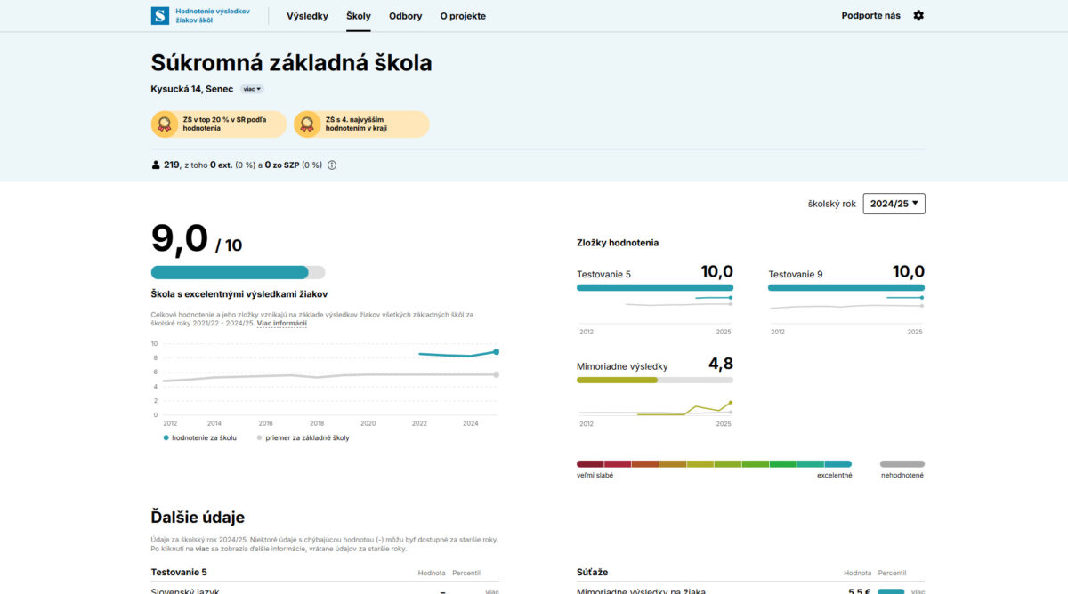 Výborné umiestnenie dosiahla aj súkromná základná škola, ktorá získala 9,0 bodu z 10 (vlani 8,3).