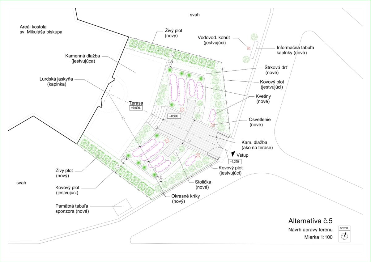 Architekt navrhol oblúkové terasy, ktoré budú po doplnení zeminy vysadené novou zeleňou. Súčasťou projektu je aj modernizácia zavlažovania z vlastnej studne, osvetlenie prístupového chodníka a jeho rekonštrukcia.