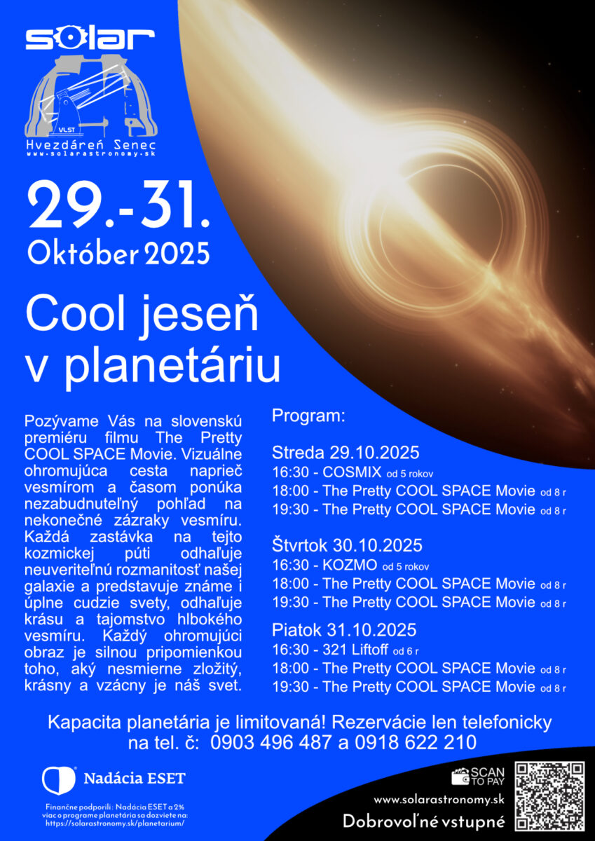 Slovenská premiéra filmu The Pretty COOL SPACE Movie. Vizuálne ohromujúca cesta naprieč vesmírom a časom ponúka nezabudnuteľný pohľad na nekonečné zázraky vesmíru. Každá zastávka na tejto kozmickej púti odhaľuje neuveriteľnú rozmanitosť našej galaxie a predstavuje známe i úplne cudzie svety, odhaľuje krásu a tajomstvo hlbokého vesmíru. Každý ohromujúci obraz je silnou pripomienkou toho, aký nesmierne zložitý, krásny a vzácny je náš svet.