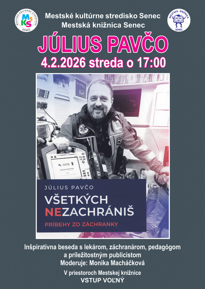 Mestské kultúrne stredisko Senec a Mestská knižnica Senec pozývajú na besedu s Júliusom Pavčom, lekárom, záchranárom, pedagógom a príležitostným publicistom.