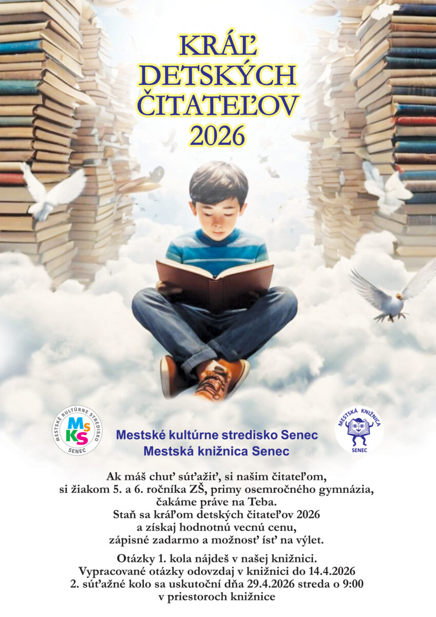 Mestské kultúrne stredisko Senec a Mestská knižnica Senec vyhlasujú novú edíciu čitateľskej súťaže Kráľ detských čitateľov 2026.