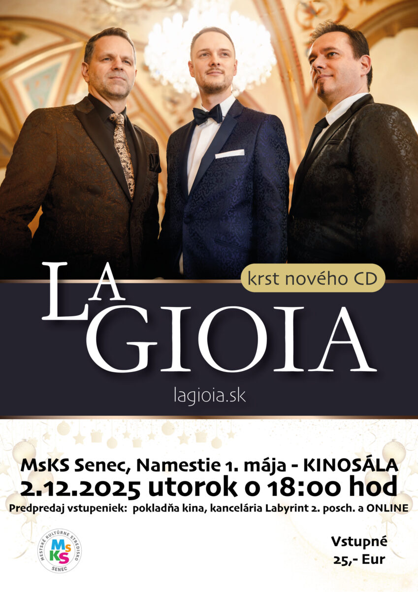 Mestské kultúrne stredisko Senec vás srdečne pozýva na koncert výnimočného vokálneho tria LA GIOIA, ktoré prichádza predstaviť svoje nové CD!