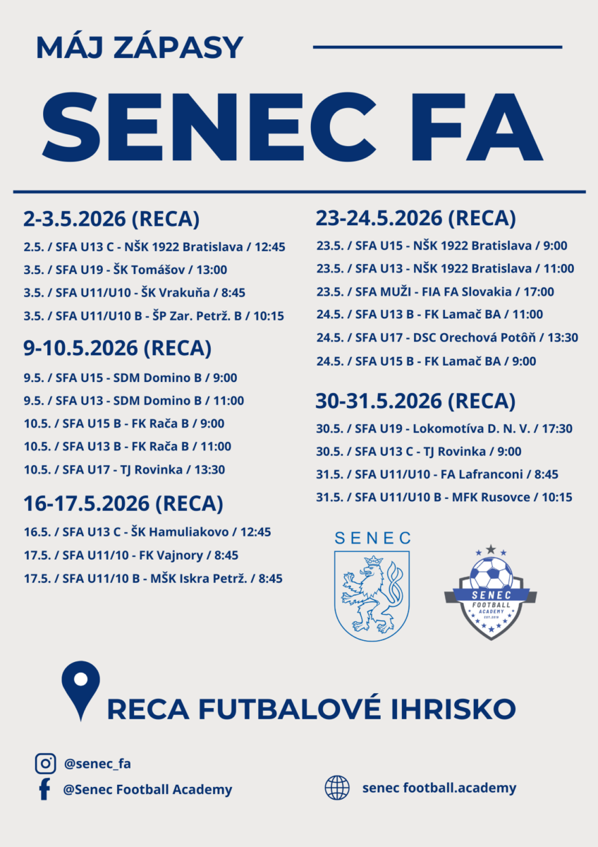 Počas mája 2026 čaká Senec Football Academy séria domácich zápasov na ihrisku RECA. Predstavia sa mládežnícke tímy aj muži v rôznych vekových kategóriách.