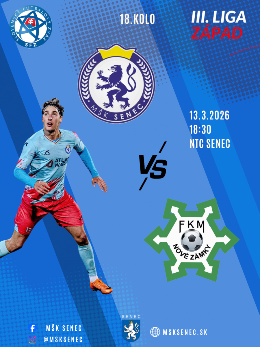 V piatok 13. marca 2026 o 18:30 nastúpi MŠK Senec na domácom ihrisku v NTC Senec na zápas 18. kola III. ligy Západ proti tímu FKM Nové Zámky.