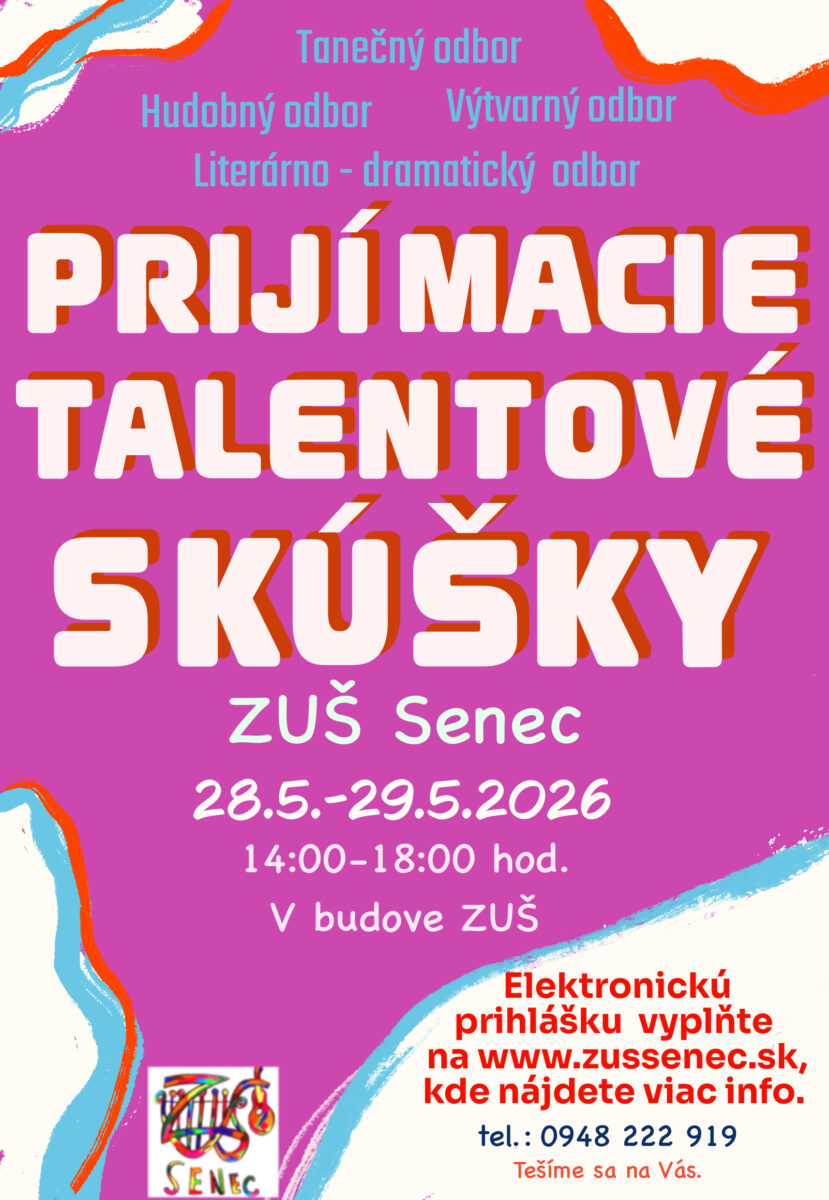 Základná umelecká škola Senec pozýva záujemcov o štúdium na prijímacie talentové skúšky, ktoré sa uskutočnia v termíne 28. 5. – 29. 5. 2026 v čase od 14:00 do 18:00 hod. v budove ZUŠ Senec.