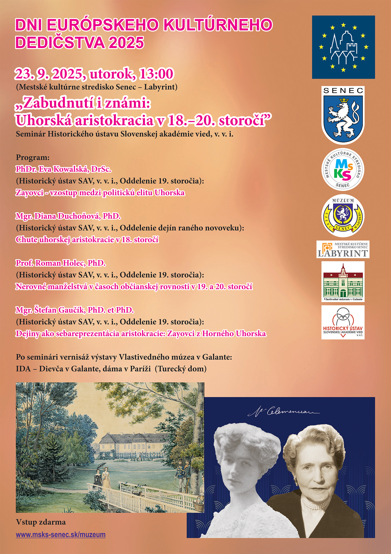 V utorok 23. septembra čakáme záujemcov o 13.00 na seminár Historického ústavu Slovenskej akadémie vied s názvom „Zabudnutí i známi: Uhorská aristokracia v 18.–20. storočí”. Seminár sa uskutoční v priestoroch KC Labyrint na 2. poschodí MsKS. Poslucháči sa dozvedia podrobnosti o stravovacích zvykoch aristokracie v 18. storočí, o vzostupe i formách sebaprezentácie rodu Zay ako aj o spoločensky nerovných manželstvách v 19. a 20. storočí. Prednášať budú PhDr. Eva Kowalská, DrSc., Mgr. Diana Duchoňová, PhD., Prof. Roman Holec, PhD. a Mgr. Štefan Gaučík, PhD. et PhD.