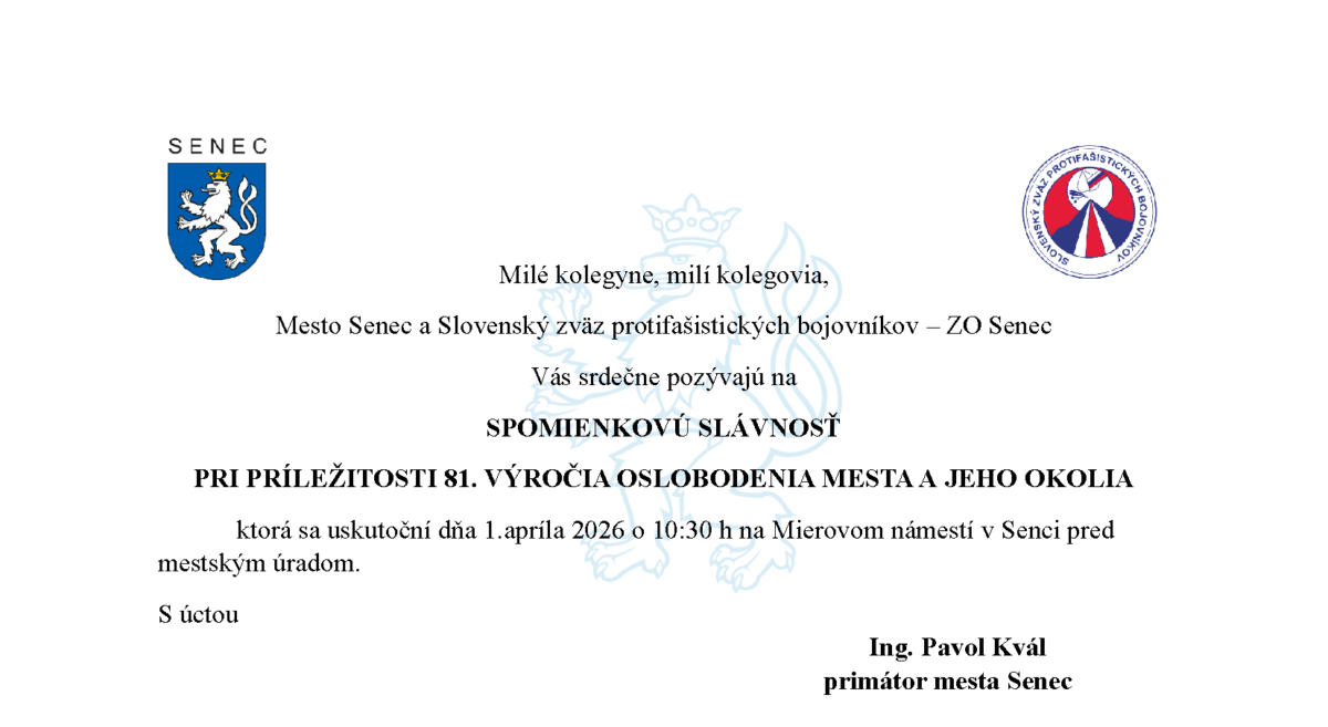 Mesto Senec a Slovenský zväz protifašistických bojovníkov – ZO Senec pozývajú verejnosť na spomienkovú slávnosť pri príležitosti 81. výročia oslobodenia mesta a jeho okolia.