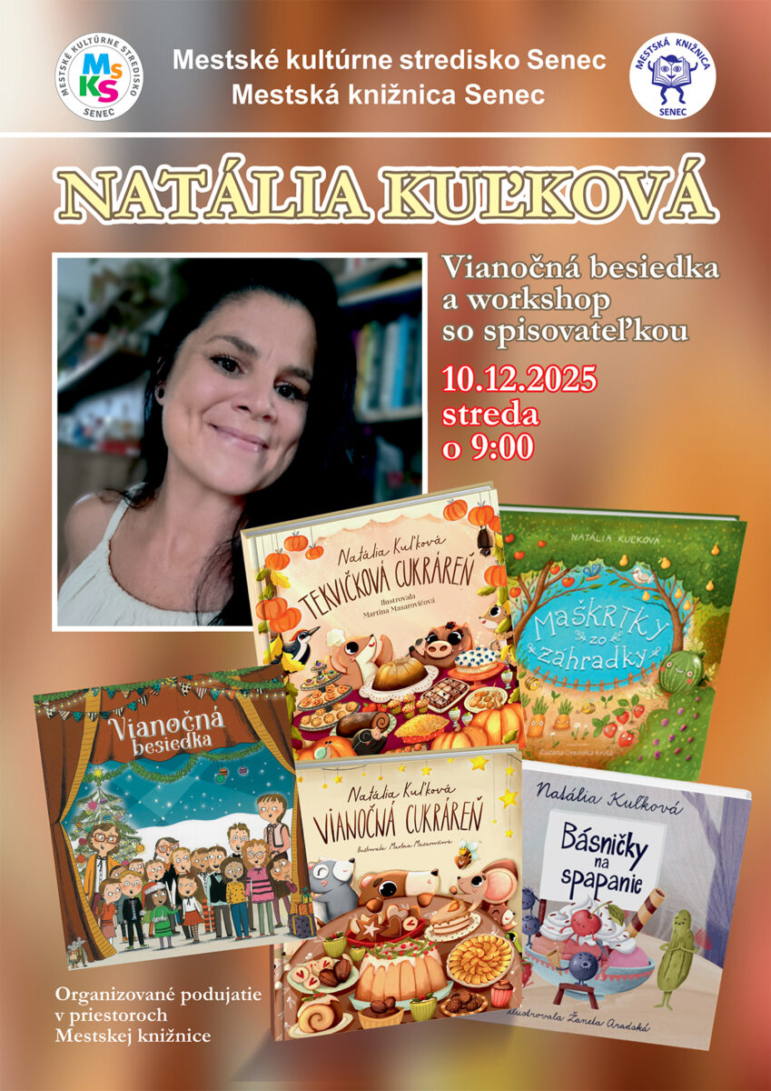 Mestské kultúrne stredisko Senec a Mestská knižnica Senec pozývajú na stretnutie so spisovateľkou Natáliou Kuľkovou, autorkou obľúbených detských kníh.