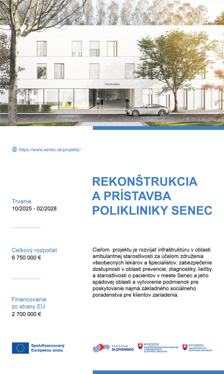 Projekt „Rekonštrukcia a prístavba polikliniky Senec“ prispeje k posilneniu všeobecnej ambulantnej starostlivosti, špecializovanej zdravotnej starostlivosti a sociálneho poradenstva v oprávnenej spádovej oblasti mesta Senec.